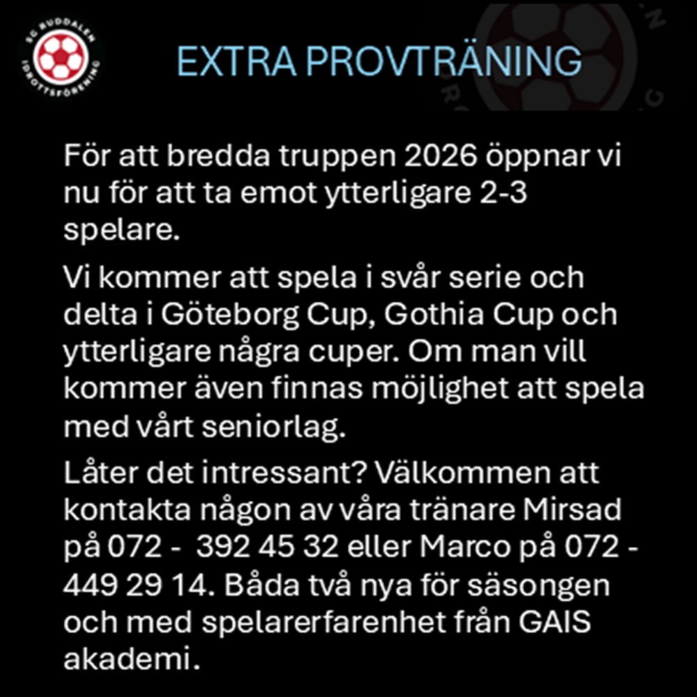 Ta kontakt med ledarna för respektive lag för att säkerställa att det finns plats i laget samt att barnet vill börja med fotboll. Vi ser därför att ert barn provtränar 3 gånger innan ni gör en anmälan och efter det så kommer föreningen att skicka ut en medlems/träningsavgift.